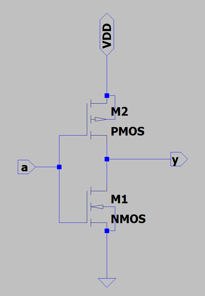 CMOS反相器由两个互补工作的MOS管组成,下图展示了CMOS反相器的电路图,其中的VDD表示电源电压,输入信号为a,输出信号为y。